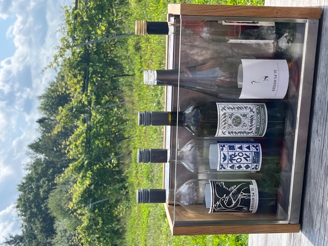 Damit kommen wir zur Weinverkostung: direkt auf dem Weinberg wurden uns die hauseigenen Weine ein Sekt gereicht. Zeitgleich kamen ein paar Wolken auf, so dass die inzwischen heiße Mittagssonne angenehm abgemildert wurde. Bei Käse, Brot und Oliven wurde in runder Formation gefachsimpelt oder die Winzerin befragt. Die Bezeichnung "Kroon" z.B. bezieht sich auf den altdeutschen Namen des Kranich, der in den umliegenden Gebieten des Weinbergs gute Brutplätze findet. 54°15' beschreibt den geographischen Breitengrad Deutsch-Nienhofs.